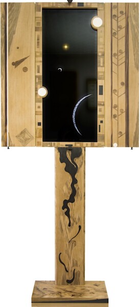 ), 2021, przestrzenny obiekt w całości intarsjowany, wykonany z drewna i płyt drewnopochodnych, szkło lacobel, podświetlenie…